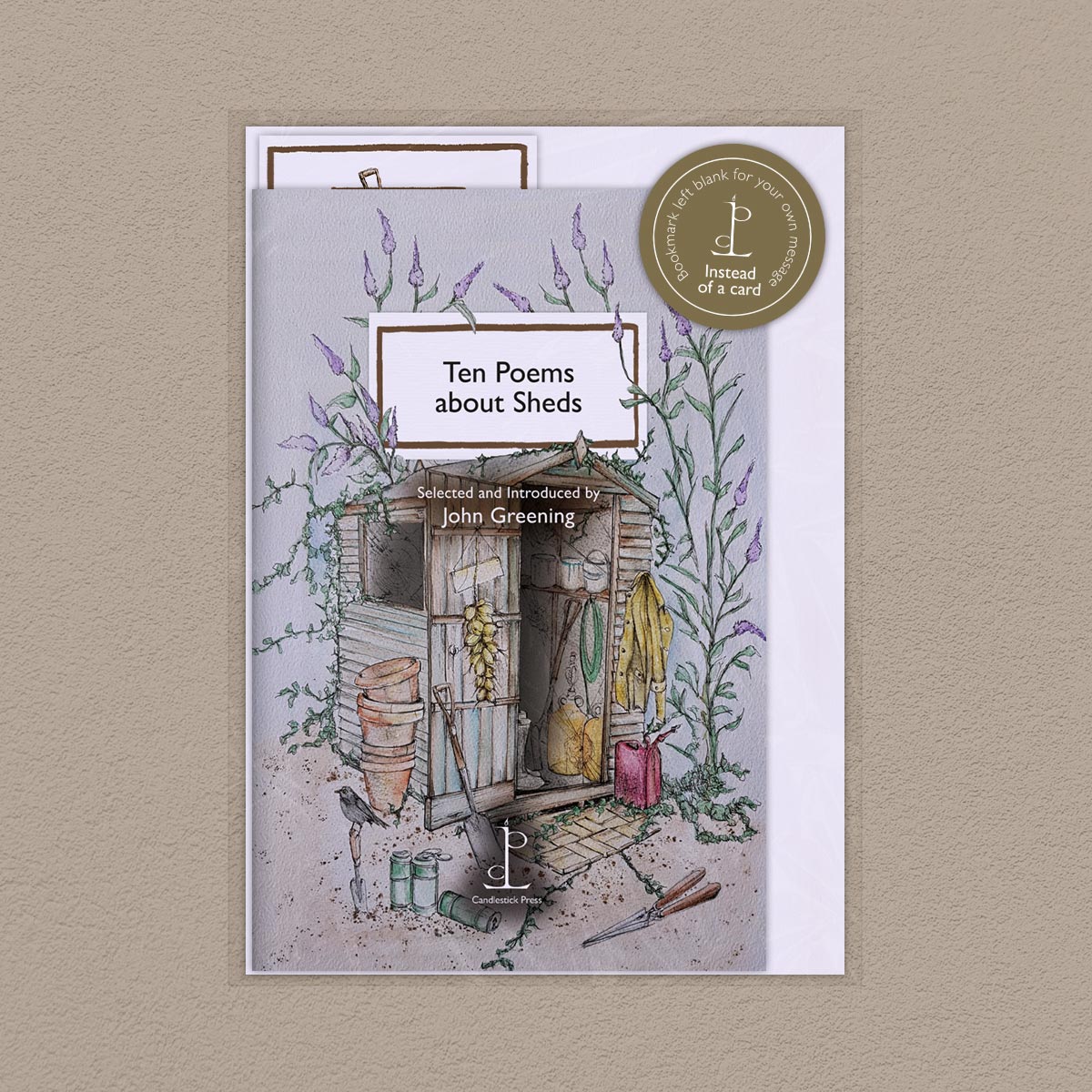 Pack image of the Ten Poems about Sheds poetry pamphlet on a decorative background